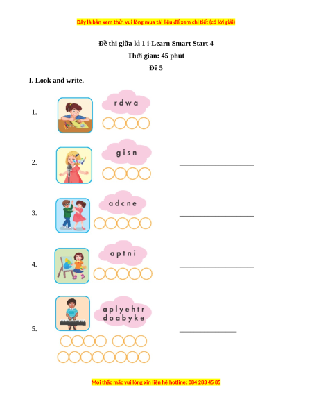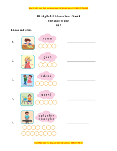 Đề thi giữa kì 1 i-Learn Smart Start 4 Thời gian: 45 phút Đề 5 I. Look and write. 1. _____________________ 2. _____________________ 3. _____________________ 4. _____________________ 5. ________________
