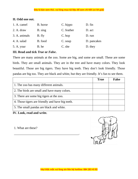 II. Odd one out. 1. A. camel B. horse C. hippo D. fin 2. A. draw B. sing C. feather D. act 3. A. animals B. fly C. hop D. run 4. A. salad B. food C. soup D. pancakes 5. A. your B. he C. she D. they