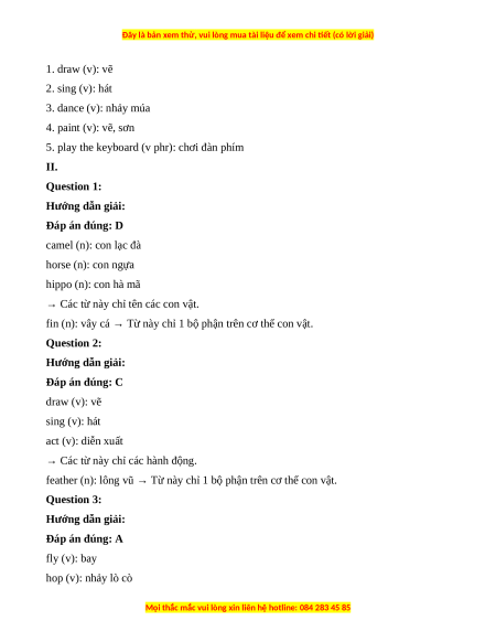 5. play the keyboard (v phr): chơi đàn phím II. Question 1: Hướng dẫn giải: Đáp án đúng: D camel (n): con lạc đà horse (n): con ngựa hippo (n): con hà mã