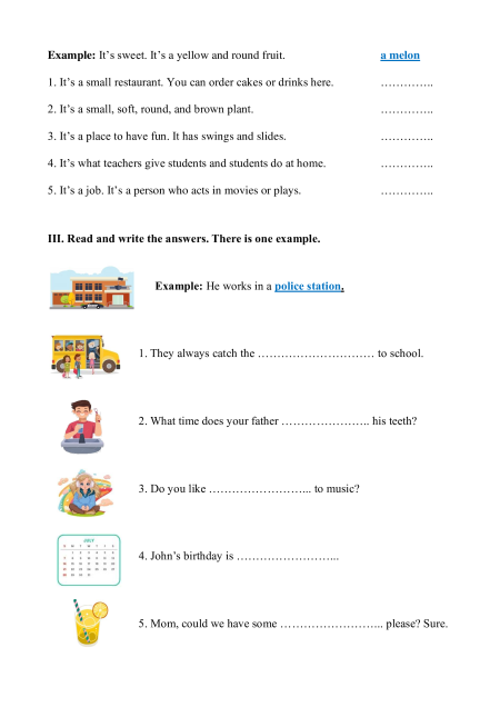 II. Read and write the correct words. homework an actor an onion a café a melon a mushroom a playground