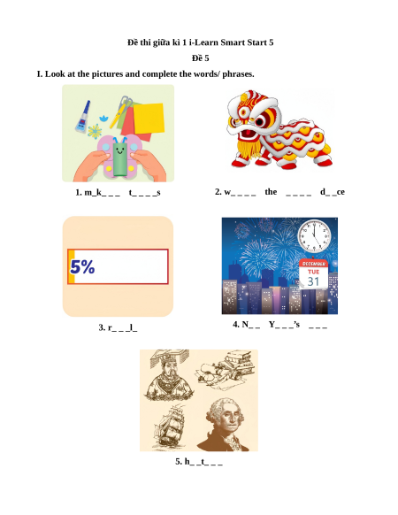Đề thi giữa kì 1 Tiếng Anh lớp 5 i-Learn Smart Start (Đề 5)