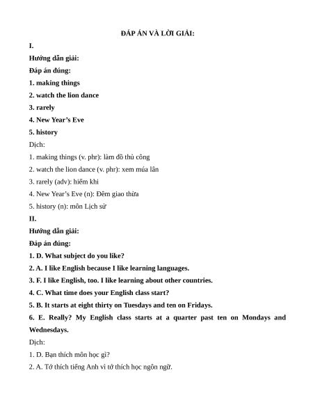 ĐÁP ÁN VÀ LỜI GIẢI: I. Hướng dẫn giải: Đáp án đúng: 1. making things 2. watch the lion dance 3. rarely 4. New Year’s Eve 5. history Dịch: