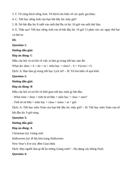 6. E. Really? My English class starts at a quarter past ten on Mondays and Wednesdays. Dịch: