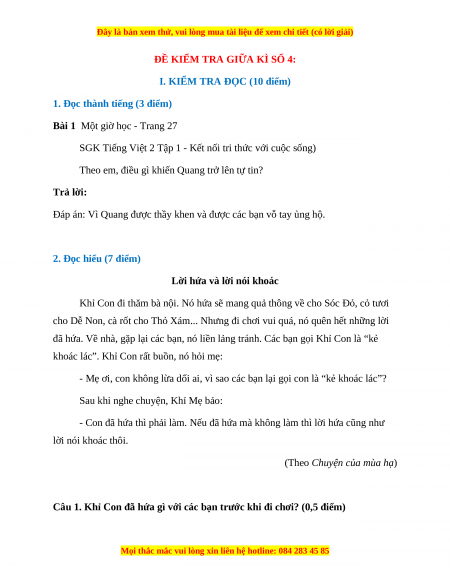 I. KIỂM TRA ĐỌC (10 điểm)