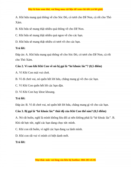 Đáp án: A. Khỉ hứa mang quả thông về cho Sóc Đỏ, cỏ tươi cho Dễ Non, cà rốt cho Thỏ Xám.