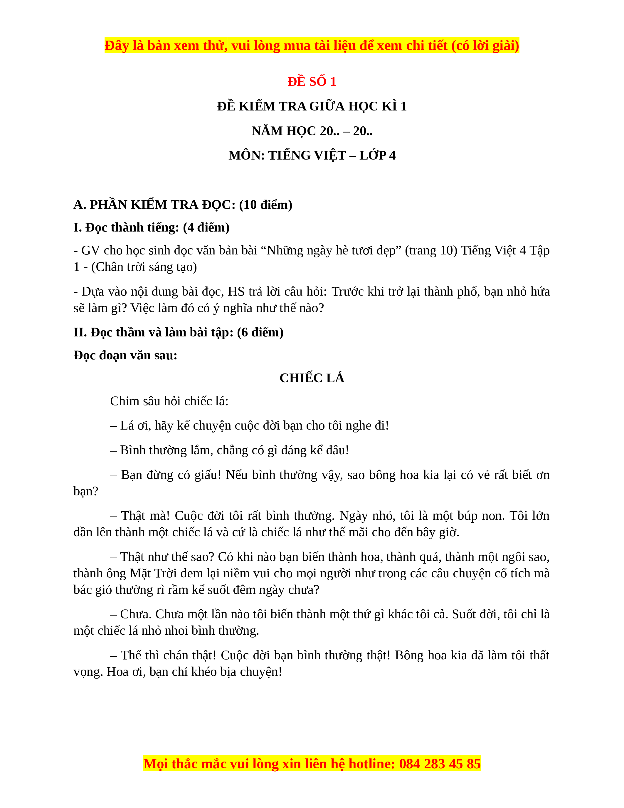 I. Đọc thành tiếng (4 điểm)