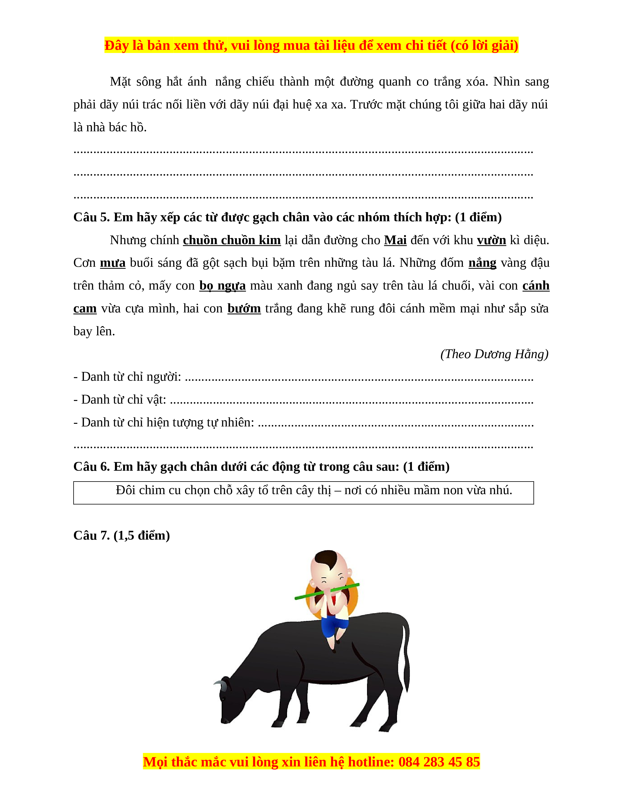 Đôi chim cu chọn chỗ xây tổ trên cây thị – nơi có nhiều mầm non vừa nhú. Câu 7. (1,5 điểm)