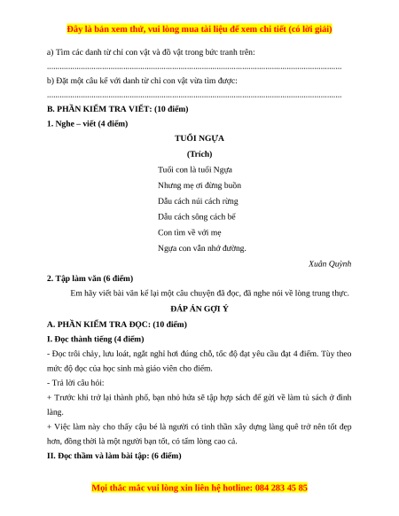 1. Nghe – viết (4 điểm) TUỔI NGỰA (Trích) Tuổi con là tuổi Ngựa Nhưng mẹ ơi đừng buồn Dẫu cách núi cách rừng Dẫu cách sông cách bể Con tìm về với mẹ
