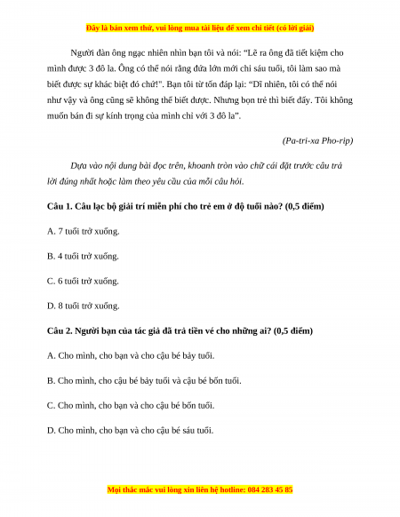 Câu 1. Câu lạc bộ giải trí miễn phí cho trẻ em ở độ tuổi nào? (0,5 điểm) A. 7 tuổi trở xuống. B. 4 tuổi trở xuống. C. 6 tuổi trở xuống. D. 8 tuổi trở xuống.