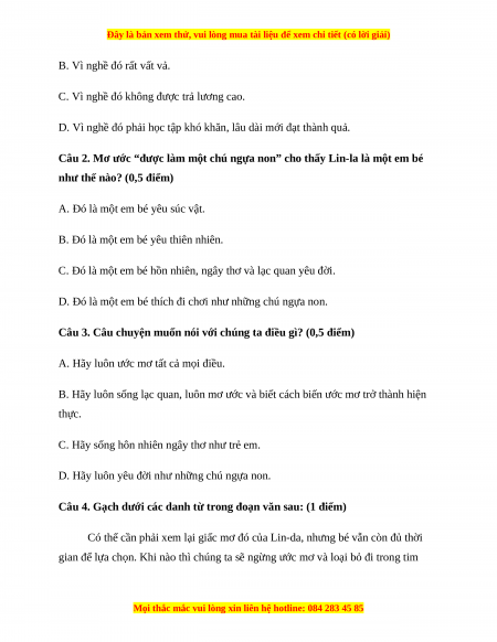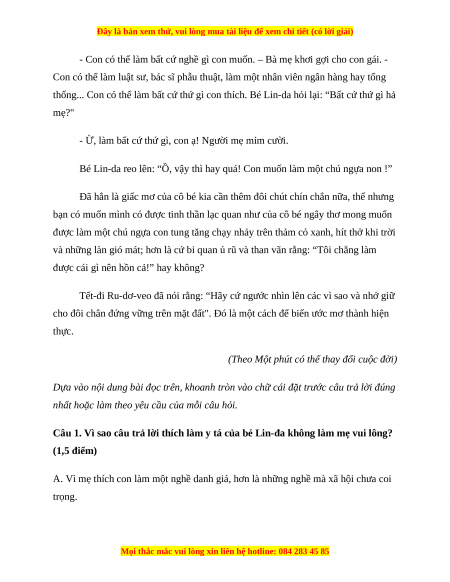 Câu 1. Vì sao câu trả lời thích làm y tá của bé Lin-đa không làm mẹ vui lông? (1,5 điểm)