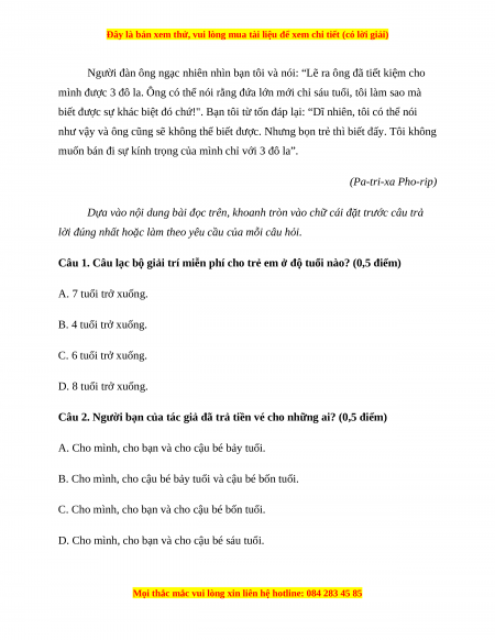 Câu 1. Câu lạc bộ giải trí miễn phí cho trẻ em ở độ tuổi nào? (0,5 điểm) A. 7 tuổi trở xuống. B. 4 tuổi trở xuống. C. 6 tuổi trở xuống. D. 8 tuổi trở xuống.