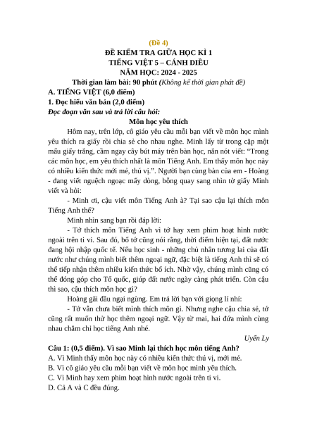 Đề thi giữa kì 1 Tiếng Việt lớp 5 Cánh diều (Đề 4)
