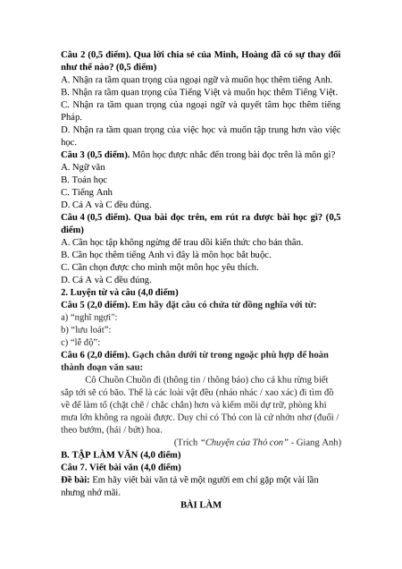 2. Luyện từ và câu (4,0 điểm) Câu 5 (2,0 điểm).