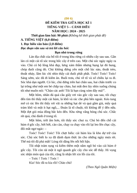 Đề thi giữa kì 1 Tiếng Việt lớp 5 Cánh diều (Đề 6)