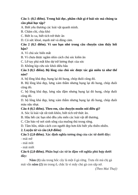 Câu 1: (0,5 điểm). Trong bài đọc, phẩm chất gì ở loài sóc mà chúng ta cần phải học tập?