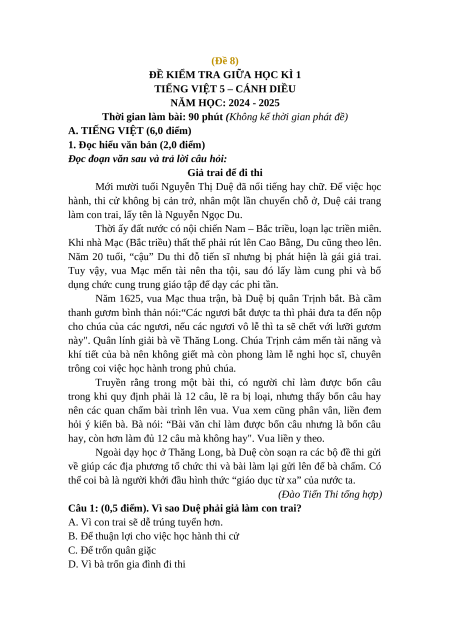 Đề thi giữa kì 1 Tiếng Việt lớp 5 Cánh diều (Đề 8)
