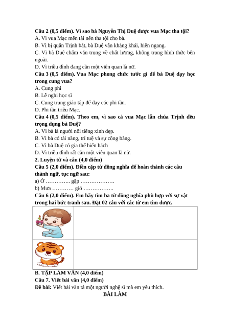 Câu 3 (0,5 điểm). Vua Mạc phong chức tước gì để bà Duệ dạy học trong cung vua? A. Cung phi B. Lễ nghi học sĩ