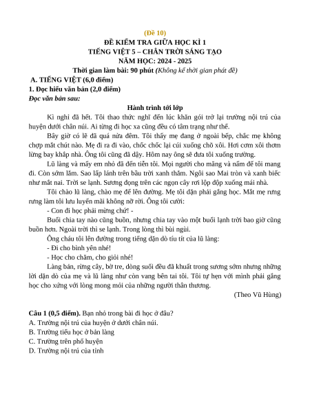 Đề thi giữa kì 1 Tiếng Việt lớp 5 Chân trời sáng tạo (Đề 10)