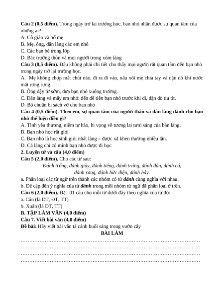 Câu 2 (0,5 điểm). Trong ngày trở lại trường học, bạn nhỏ nhận được sự quan tâm của những ai? A. Cô giáo và bố mẹ