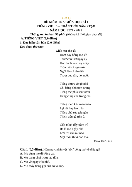 Đề thi giữa kì 1 Tiếng Việt lớp 5 Chân trời sáng tạo (Đề 4)