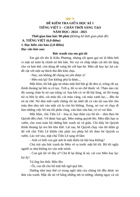 Đề thi giữa kì 1 Tiếng Việt lớp 5 Chân trời sáng tạo (Đề 7)