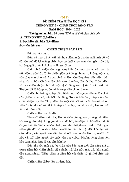 Đề thi giữa kì 1 Tiếng Việt lớp 5 Chân trời sáng tạo (Đề 8)
