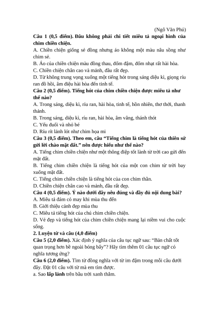 Câu 1 (0,5 điểm). Đâu không phải chi tiết miêu tả ngoại hình của chim chiền chiện.