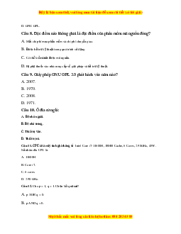 Câu 7. Giấy phép được áp dụng rộng rãi nhất là? A. GLU GPL. B. GNU GPN. C. GLU GPN.