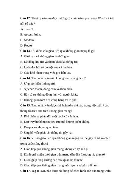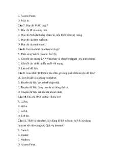 Câu 12. Thiết bị nào sau đây thường có chức năng phát sóng Wi-Fi và kết nối có dây? A. Switch. B. Access Point. C. Modem. D. Router.
