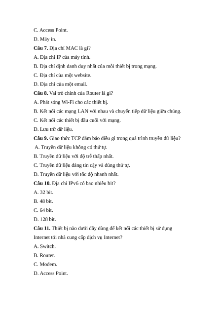 Câu 10. Địa chỉ IPv6 có bao nhiêu bit? A. 32 bit. B. 48 bit. C. 64 bit. D. 128 bit.