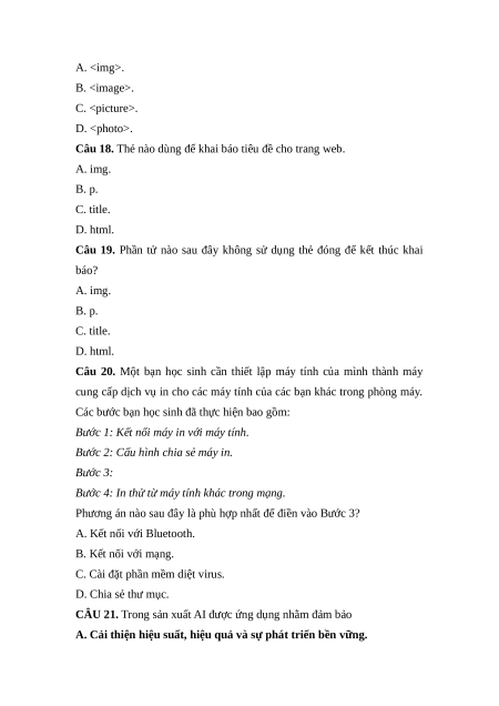 Câu 17. Tag HTML nào được sử dụng để chèn hình ảnh vào trang web? A. . B. . C. . D. .