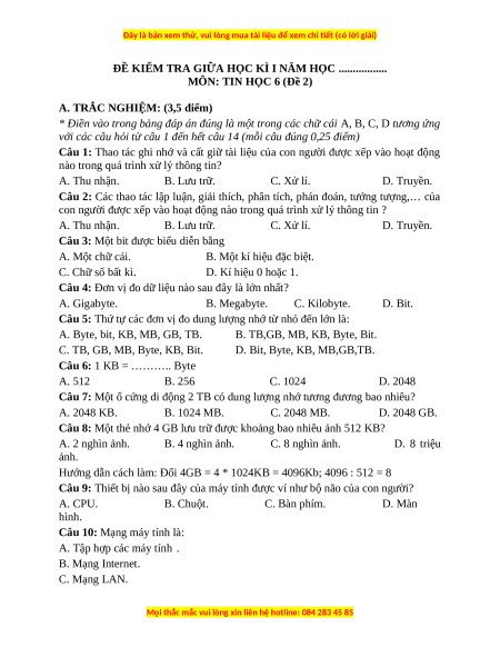Câu 6: 1 KB = ……….. Byte A. 512 B. 256 C. 1024 D. 2048