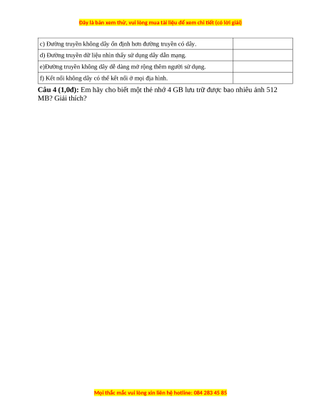 Câu 4 (1,0đ): Em hãy cho biết một thẻ nhớ 4 GB lưu trữ được bao nhiêu ảnh 512 MB? Giải thích?