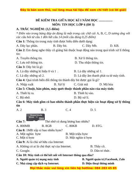 MÔN: TIN HỌC LỚP 6 (Đề 3)