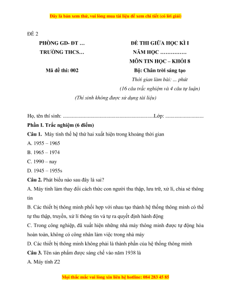 Đề thi giữa kì 1 Tin học 8 Chân trời sáng tạo (đề 2)