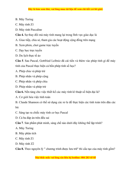 Câu 7. Sản phẩm phát minh, sáng chế nào dưới đây không thể lập trình? A. Máy Turing B. Máy phân tích C. Máy tính Z1 D. Máy tính Z2