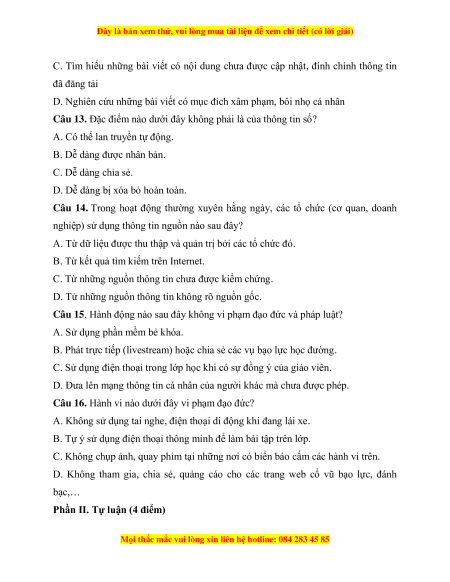 Câu 13. Đặc điểm nào dưới đây không phải là của thông tin số?