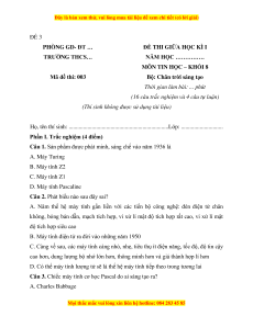 Câu 1. Sản phẩm được phát minh, sáng chế vào năm 1936 là A. Máy Turing B. Máy tính Z2 C. Máy tính Z1 D. Máy tính Pascaline