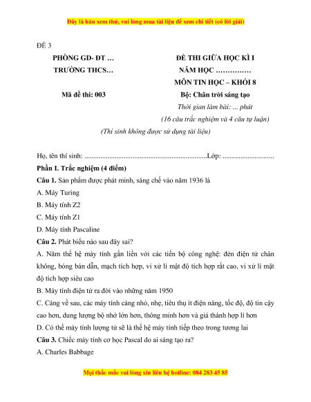 Đề thi giữa kì 1 Tin học 8 Chân trời sáng tạo (đề 3)