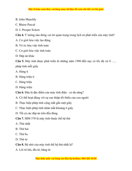 Câu 5. Máy tính được phát triển từ những năm 1990 đến nay có tốc độ xử lí ….. phép tính mỗi giây A. Hàng tỉ B. Hàng triệu tỉ C. Hàng triệu D. Hàng triệu