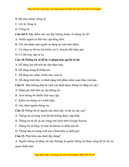 Câu hỏi 9. Đặc điểm nào sau đây không thuộc về thông tin số?