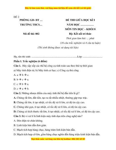 Đề thi giữa kì 1 Tin học 8 Kết nối tri thức (đề 2)