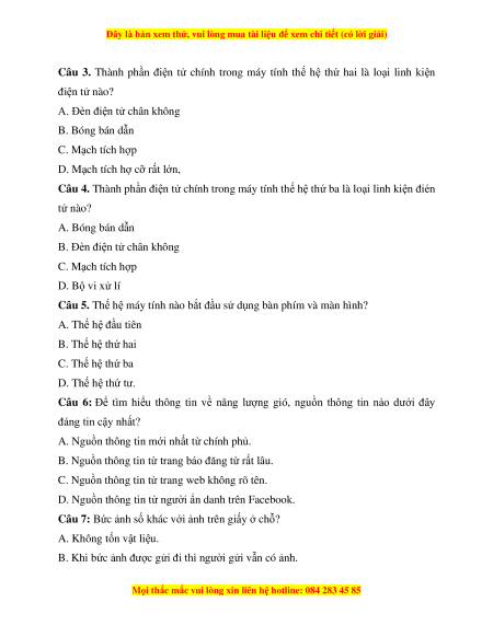 Câu 5. Thế hệ máy tính nào bắt đầu sử dụng bàn phím và màn hình? A. Thế hệ đầu tiên B. Thế hệ thứ hai C. Thế hệ thứ ba D. Thế hệ thứ tư.