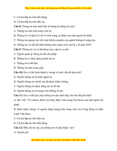 Câu 12: Mức độ tin cậy của thông tin số phụ thuộc vào? A. Nguồn gốc
