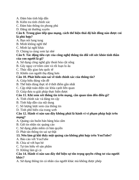 Câu 8. Trong giao tiếp qua mạng, cách thể hiện thái độ bất đồng nào được coi là phù hợp? A. Bạn nói lung tung B. Mình không nghĩ thế C. Mình lại nghĩ khác