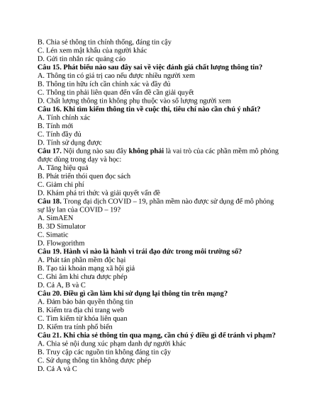 Câu 16. Khi tìm kiếm thông tin về cuộc thi, tiêu chí nào cần chú ý nhất? A. Tính chính xác B. Tính mới C. Tính đầy đủ D. Tính sử dụng được