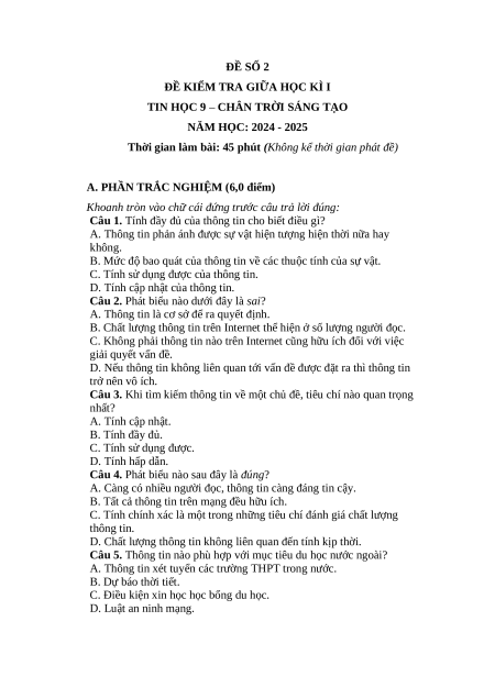 Đề thi giữa kì 1 Tin học 9 Chân trời sáng tạo (Đề 2)