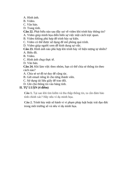 Câu 3. Khi tìm kiếm thông tin về một chủ đề, tiêu chí nào quan trọng nhất? A. Tính cập nhật. B. Tính đầy đủ. C. Tính sử dụng được. D. Tính hấp dẫn.