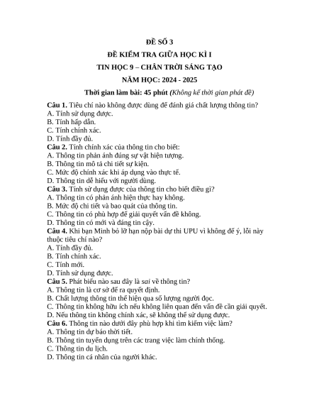 Đề thi giữa kì 1 Tin học 9 Chân trời sáng tạo (Đề 3)