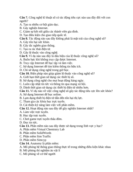 Câu 7. Công nghệ kĩ thuật số có tác động tiêu cực nào sau đây đối với con người?